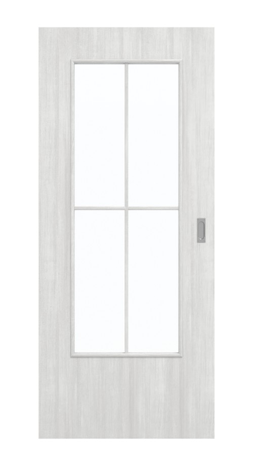 Duży otwór świetlny umieszczony w środku skrzydła drzwi zapewnia jasną atmosferę wewnętrzną. Jest podzielony eleganckimi szprosami na cztery równe pola. Drzwi w szarej okleinie drewnianej zachwycają nowoczesnym wyglądem. Delikatne cienie tworzą pionowe usłojenia na skrzydle drzwi. Drzwi emanują chłodnym urokiem. Powierzchnia HPL okazuje się niezwykle odporna na obciążenia mechaniczne.
