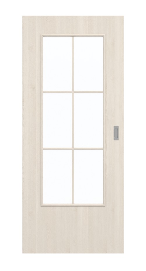 Jasną atmosferę we wnętrzu zapewnia duży otwór wpuszczony w środkowej części skrzydła drzwi. Dzięki eleganckiej ramie z szprosami szkło podzielone jest na sześć mniejszych prostokątów. Drzwi przesuwne idealnie nadają się do wnętrz urządzonych w stylu skandynawskim. Powierzchnia o wyglądzie drewna ma jasny kolor. Delikatne słoje drewna tworzą harmonijny całościowy efekt. Materiał powierzchniowy wykonany jest z łatwego w pielęgnacji i wytrzymałego CPL.