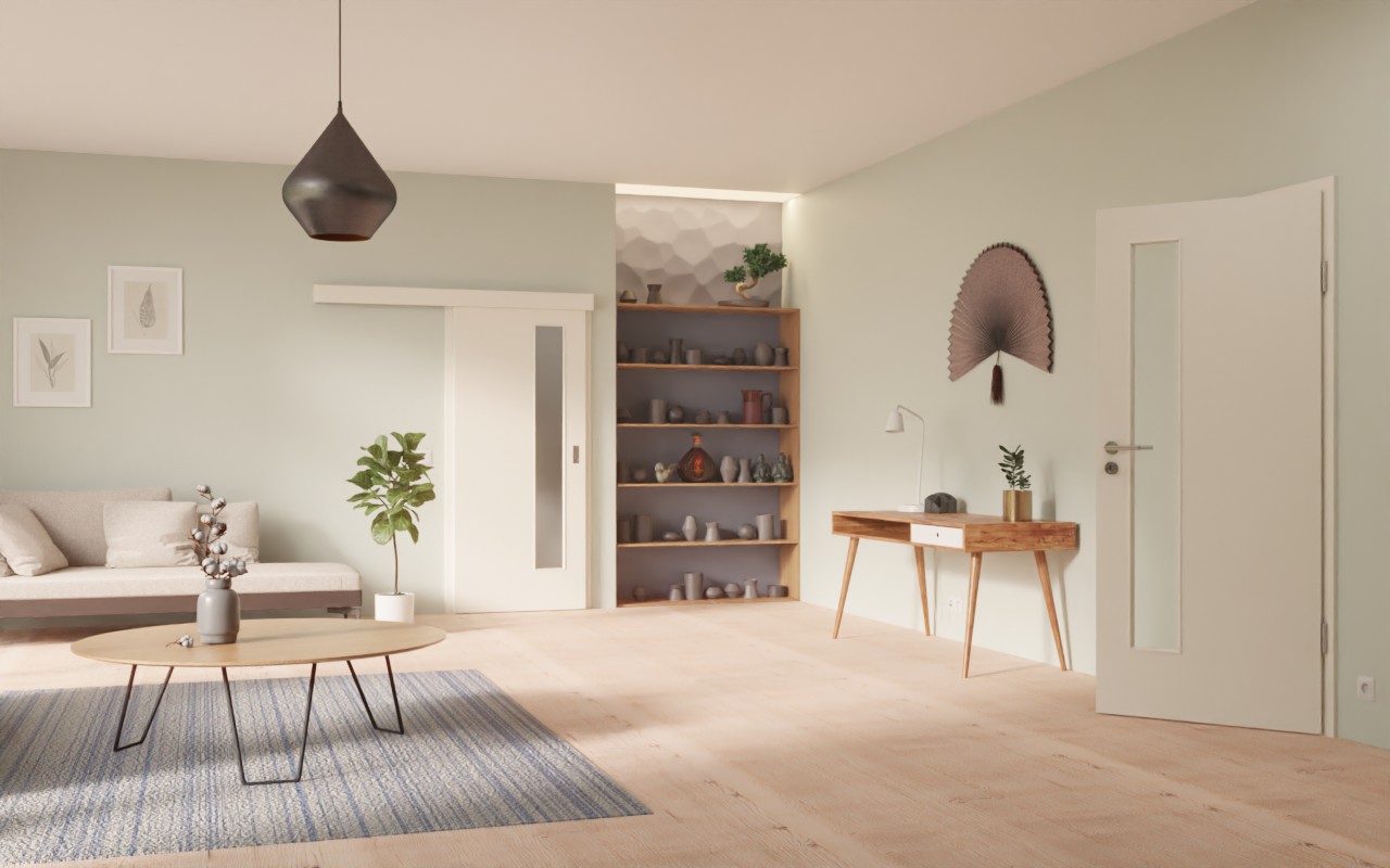 Centralnym elementem projektu drzwi jest smukły, prostokątny otwór na światło. Pod względem wyglądu i wrażenia dotykowego drzwi wyróżniają się wykończeniem w postaci jedwabiście matowej białej farby. Lakier utwardzany promieniowaniem UV jest przyjazny dla środowiska i łatwy w pielęgnacji.