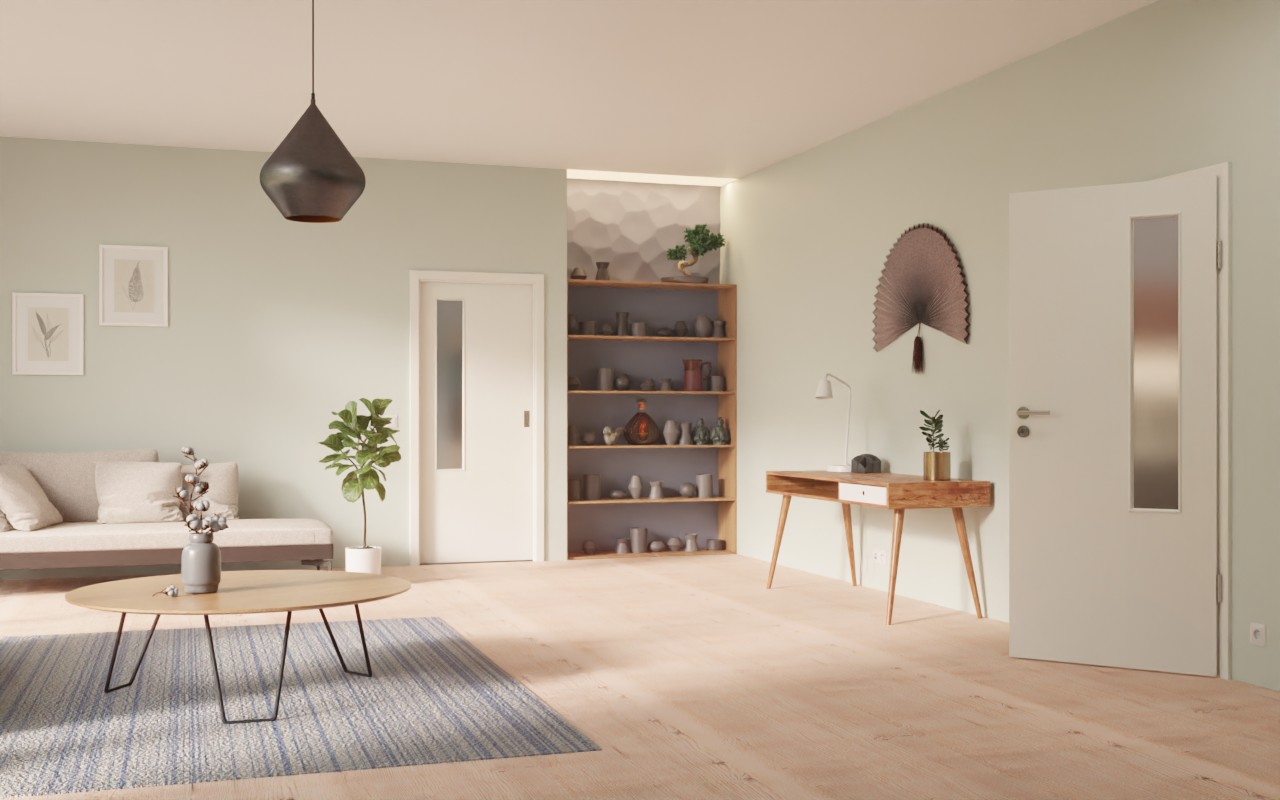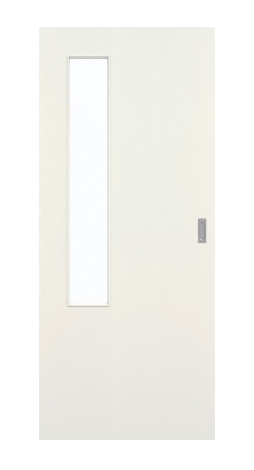Dzięki prostokątnemu wycięciu w szybie po stronie zawiasów mogą Państwo cieszyć się światłem, a tym samym przyjazną atmosferą w swoich pomieszczeniach. Te drzwi przesuwne wyróżniają się prostym wzornictwem. Dzięki białemu wykończeniu drzwi idealnie komponują się z każdym wystrojem wnętrza. Wyrafinowanym akcentem jest delikatna faktura powierzchni. Wierzchnia warstwa wykonana z CPL jest niezwykle trwała i odporna na zabrudzenia.