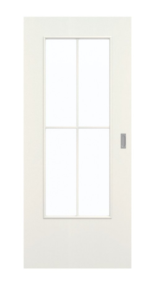 Przeszklenie na środku skrzydła drzwiowego zapewniające jasność i przyjazną atmosferę we wnętrzu. Jest podzielona ramą z poprzeczkami na cztery równe prostokąty. Te drzwi przesuwne zachwycają eleganckim wyglądem. Białe skrzydło drzwiowe pasuje do każdego stylu wnętrza. Przyjemna faktura powierzchni nadaje całości harmonijny wygląd. Odporna na światło warstwa wierzchnia HPL wykazuje się wyjątkową wytrzymałością.