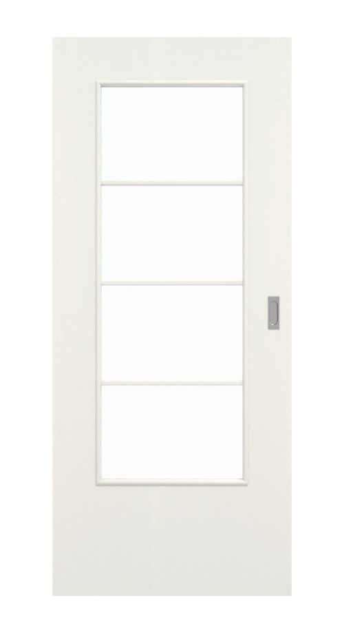Szklany wstawka pośrodku skrzydła drzwiowego zapewnia jasny i przyjazny klimat wnętrza. Jest harmonijnie podzielony poziomymi prętami. Te drzwi przesuwne zachwycają eleganckim wyglądem. Biały kolor powierzchni pasuje do każdego stylu wnętrza. Lekko teksturowana powierzchnia dopełnia minimalistyczny wygląd całości. Powierzchnia wykonana z HPL jest łatwa w pielęgnacji i odporna na zabrudzenia.