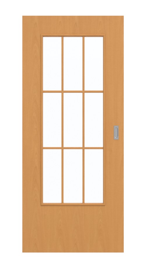 Materiałem podstawowym tych drzwi jest płyta wiórowa pełna. Są one sklasyfikowane do grupy obciążenia M. Dlatego drzwi te mogą być stosowane zarówno w biurze, jak i w pomieszczeniach prywatnych. W zestawie znajduje się rowek prowadzący podłogowy oraz prostokątny uchwyt wpuszczany muszlowy z owalnym chwytem.