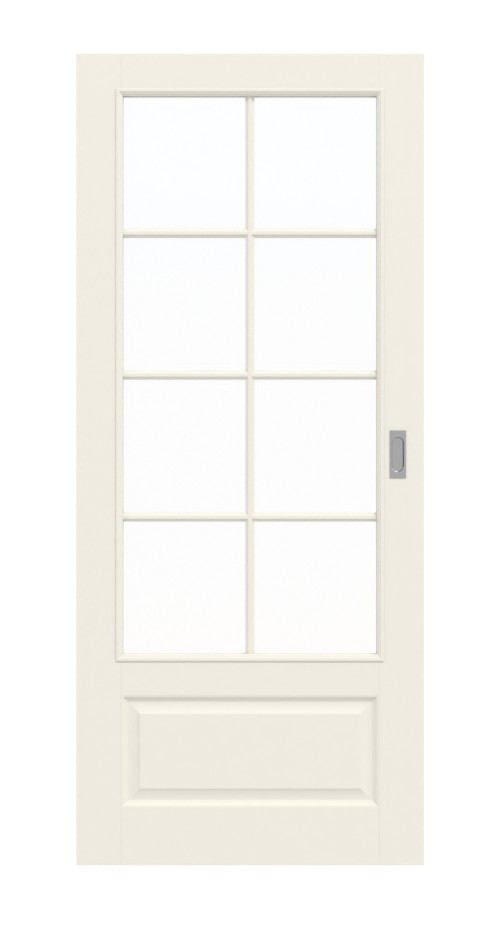 Delikatna rama z szprosami dzieli duże przeszklenie optycznie na osiem pól. W dolnej części drzwi wytłoczone wypełnienie uzupełnia klasyczny design. Model jest wykończony kilkoma warstwami białego lakieru o satynowo-matowym wykończeniu.