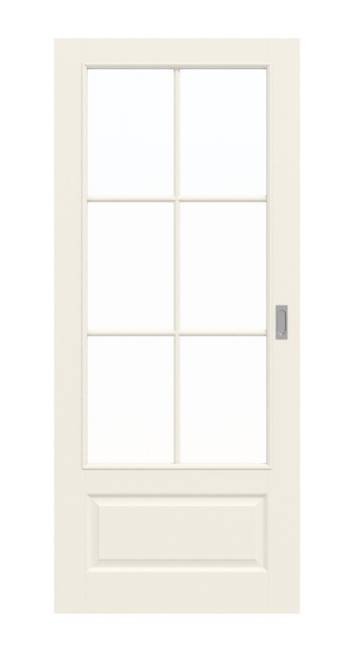 Duże przeszklenie z ramą przyciąga wzrok i pozwala na piękne doświetlenie wnętrza. Dolna część skrzydła drzwi ozdobiona jest mniejszym wypełnieniem. Ponieważ matowy lakier w kolorze białym jest nakładany wielokrotnie i utwardzany UV, powstaje trwałe i łatwe w pielęgnacji wykończenie o przyjemnej fakturze.