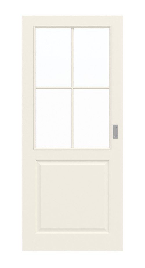 W górnej części skrzydła drzwi znajduje się świetlik z ramą z przegrodami, który zapewnia dodatkowe światło dzienne w ciemnym korytarzu. Wytłoczona wypełnienie podkreśla klasyczny wygląd. Ponieważ matowa biała farba jest nakładana wielokrotnie i utwardzana UV, powstaje trwałe i łatwe w pielęgnacji wykończenie o przyjemnej fakturze.
