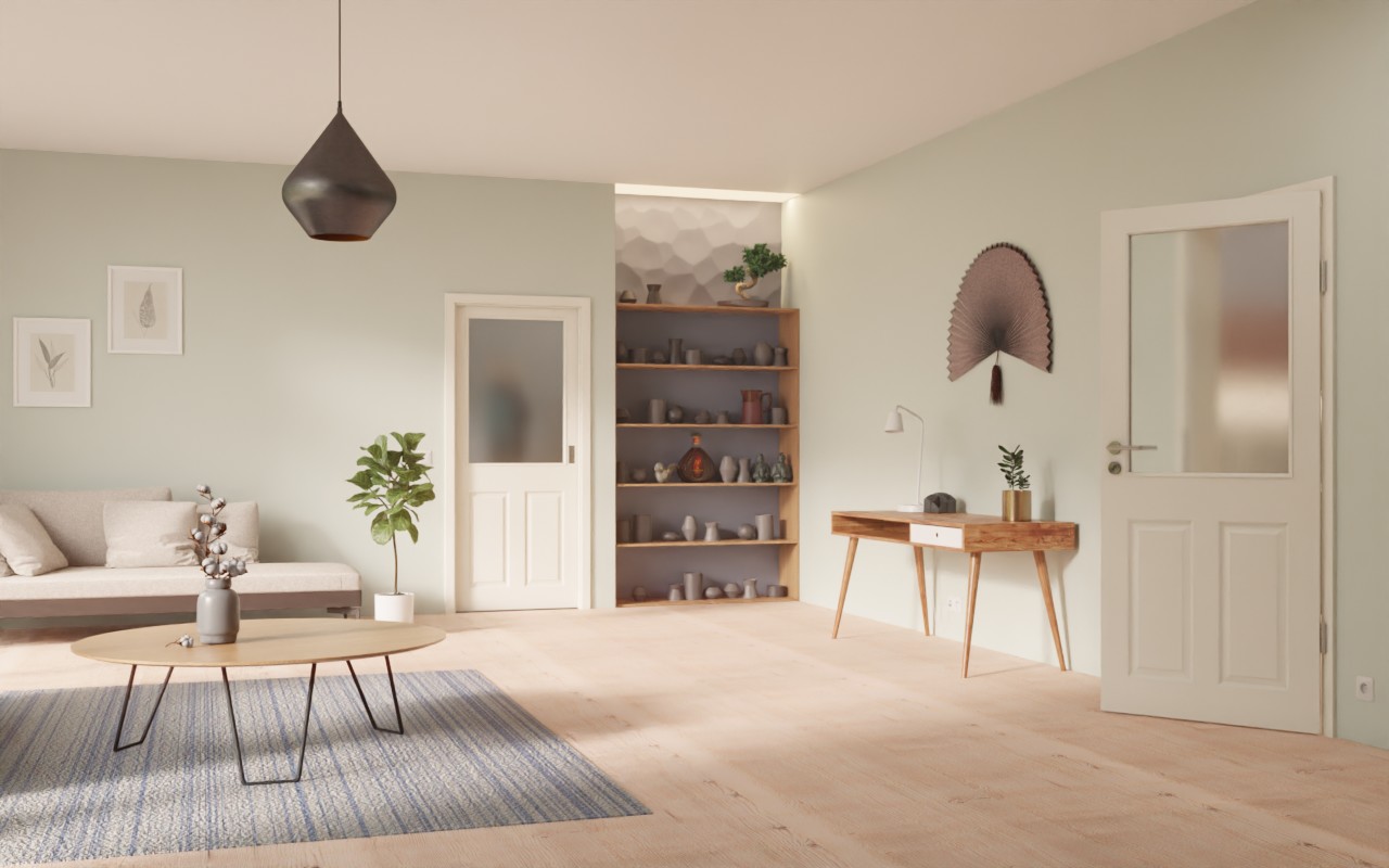 W dolnej części skrzydła drzwiowego znajdują się dwie eleganckie wypełnienia. Powyżej znajduje się prostokątny otwór świetlny. Półmatowe, białe wykończenie powstaje dzięki wielokrotnemu nałożeniu lakieru akrylowego w kolorze RAL 9010 lub RAL 9016.