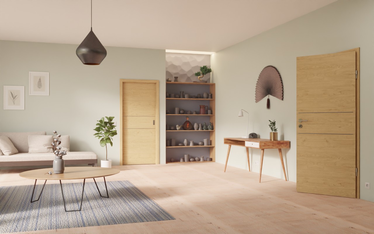 W pomieszczeniu wewnętrznym drzwi składają się z rdzenia z rurki, połączonego z ramą MDF i płytą HDF. W zestawie znajduje się skrzydło drzwi wraz z rowkiem prowadzącym w dolnej części oraz uchwytem w kolorze stali nierdzewnej.