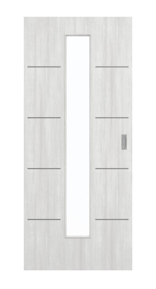 W środkowej części skrzydła drzwiowego znajduje się wąskie, pionowe wycięcie na szybę. Obok delikatne lizeny rozciągają się wzdłuż całej powierzchni. Odświeżający odcień szarości z subtelnymi niuansami rozciąga się wzdłuż skrzydła drzwi. Powierzchnia CPL okazuje się odporna na uderzenia i zarysowania . Jest odporna na działanie światła i łatwa w czyszczeniu.
