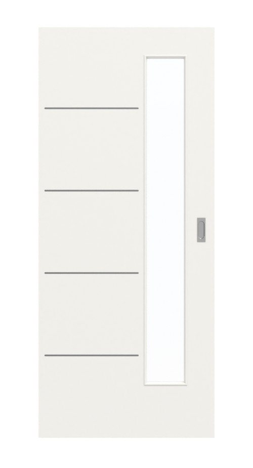 Z boku skrzydła drzwiowego znajduje się długie wycięcie na szybę. Krótkie lizeny podkreślają prostoliniowy wygląd, który emanuje delikatnym spokojem. Dekor utrzymany jest w kolorze białego lakieru 9016, który cieszy się dużą popularnością w aranżacji wnętrz. Powierzchnia CPL okazuje się odporna na uderzenia i zarysowania . Jest odporna na działanie światła i łatwa w czyszczeniu.