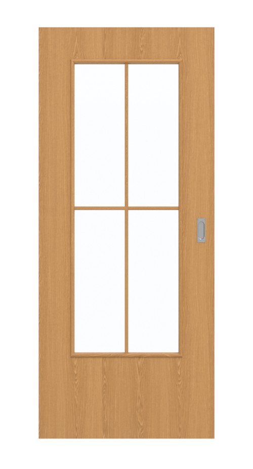 Za jasną atmosferę wnętrza odpowiada duży otwór wpuszczony w środkowej części skrzydła drzwi. Jest podzielony eleganckimi szprychami na cztery równe pola. Dzięki żywemu dekorowi dębowemu te przesuwne drzwi przyciągają wzrok. Po powierzchni skrzydła drzwiowego biegną płynne słoje. Dzięki ciepłym brązowym odcieniom drzwi tworzą w pomieszczeniu przytulną atmosferę. Warstwa wierzchnia wykonana z HPL jest bardzo trwała i odporna na zabrudzenia.