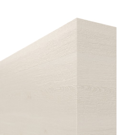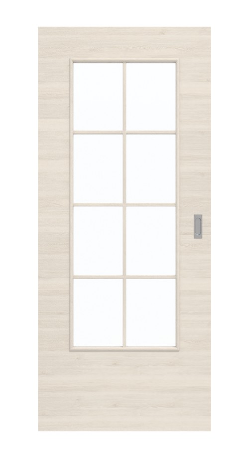 Dzięki dużemu wycięciu na szybę w środkowej części skrzydła drzwiowego do pomieszczeń wpada mnóstwo światła. Delikatne szprosy dzielą go na osiem równych pól. Model z drzwiami przesuwnymi zachwyca spokojnym designem. Drobne usłojenia rozciągają się na skrzydle drzwiowym w jasnym wykończeniu wizualnym drewna. Rysunek jest naniesiony poziomo. Odporna na światło warstwa wierzchnia HPL wykazuje się wyjątkową wytrzymałością.