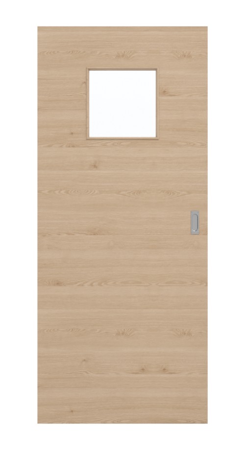 Wycięcie na szynę, które charakteryzuje górną część skrzydła drzwiowego, ma kształt kwadratu. Delikatne usłojenia i filigranowe sęki zdobią poprzeczny dekor drewna. Te dynamiczne rysunki sprawiają wrażenie harmonijnych. Drzwi przesuwne, dzięki swoim naturalnym brązowym odcieniom, tworzą przytulną atmosferę. Materiał powierzchniowy wykonany z CPL jest wytrzymały i odporny na zarysowania.
