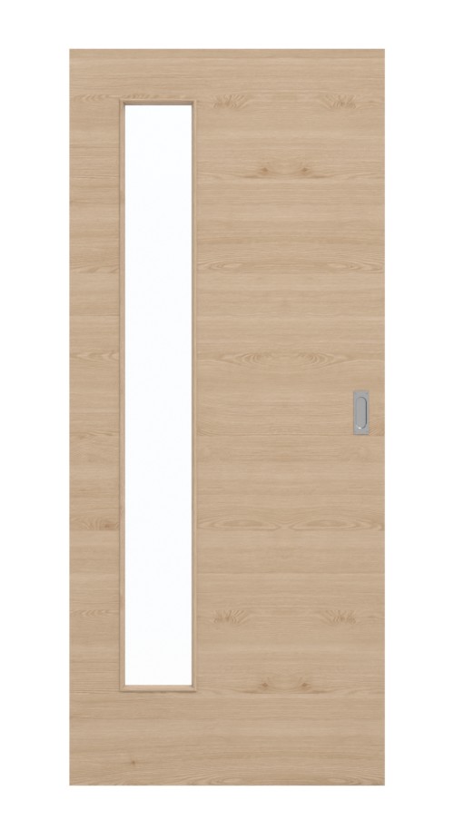 Podłużne wycięcie na szybę po stronie zawiasów zapewnia jasny wystrój wnętrza. Nowoczesny wygląd nadaje poprzeczny dekor drewna z drobnym usłojeniem. Te rysunki nadają projektowi wyjątkowego charakteru. Drzwi przesuwne, dzięki swoim naturalnym brązowym odcieniom, tworzą przytulną atmosferę. Powierzchnia HPL jest odporna na działanie światła i niezwykle wytrzymała.