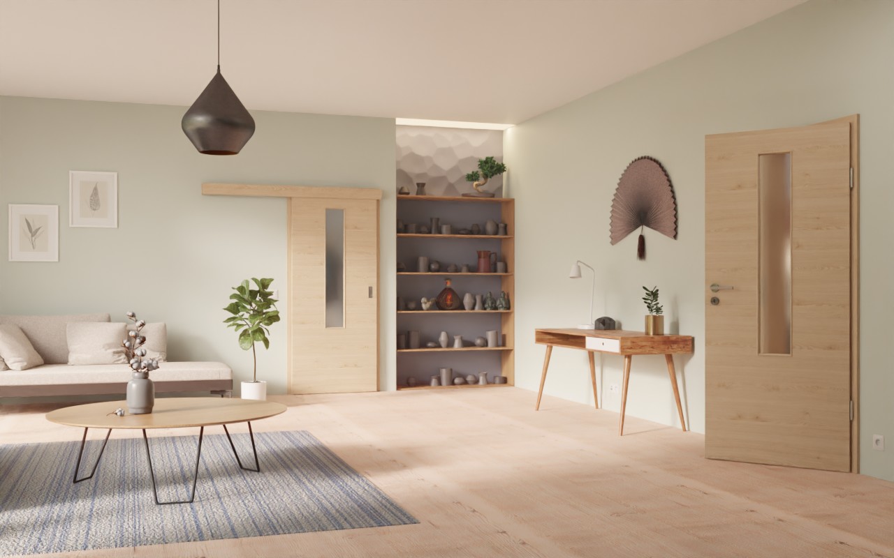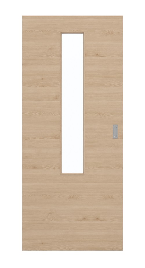 W górnej części skrzydła drzwiowego znajduje się wąska, umieszczona na środku powierzchnia szklana. Dzięki podłużnemu przeszkleniu światło wpada do pomieszczeń. Delikatne, poprzeczne słoje i drobne sęki nadają charakteru autentycznemu dekorowi drewnianemu. Te dynamiczne rysunki sprawiają wrażenie harmonijnych. Dzięki swoim naturalnym odcieniom drzwi przesuwne tworzą przytulną atmosferę. Stabilna i łatwa w pielęgnacji powierzchnia z HPL jest odporna na obciążenia mechaniczne i wysoką temperaturę.