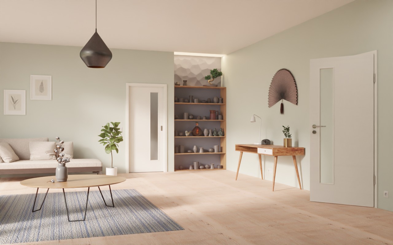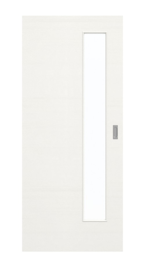 Wąskie przeszklenie zapewnia indywidualny wygląd drzwi. Model z drzwiami przesuwnymi i białym dekorem drewna zachwyca nowoczesnym wyglądem. Drobne usłojenia przebiegają w poprzek skrzydła drzwiowego. Minimalistyczny dekor można z łatwością połączyć z każdym stylem wyposażenia wnętrz. Światło, ciepło i ścieranie mechaniczne nie mają większego wpływu na wytrzymałą warstwę wierzchnią z HPL.