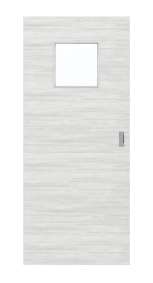 Jasne wnętrze zapewnia kwadratowy wycięty otwór, umieszczony w górnej części skrzydła drzwi. Drzwi przesuwne z szarym wykończeniem drewnopodobnym wyróżniają się nowoczesnym wyglądem. Delikatne słoje zdobią skrzydło drzwi. Ten poprzeczny wzór zachwyca swoim wyrafinowanym charakterem. Powierzchnia z płyty HPL jest odporna na zarysowania i ścieranie.