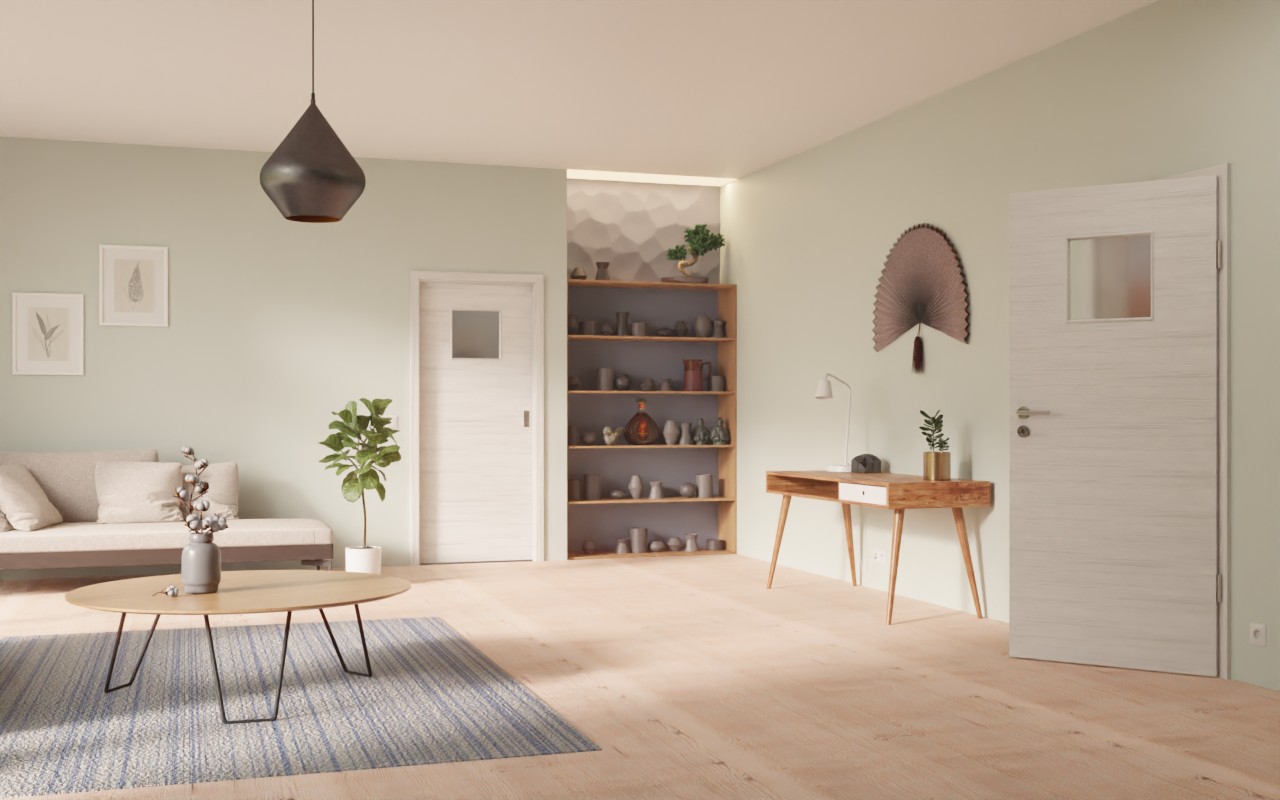 Rdzeń drzwi stanowi płyta wiórowa o średniej gęstości. Ze względu na przynależność do grupy obciążenia M nadaje się zarówno do pomieszczeń biurowych, jak i do użytku domowego. Dzięki prostokątnej klamce z owalnym uchwytem oraz rowkowi prowadzącemu w dolnej części drzwi można je łatwo otwierać i zamykać.