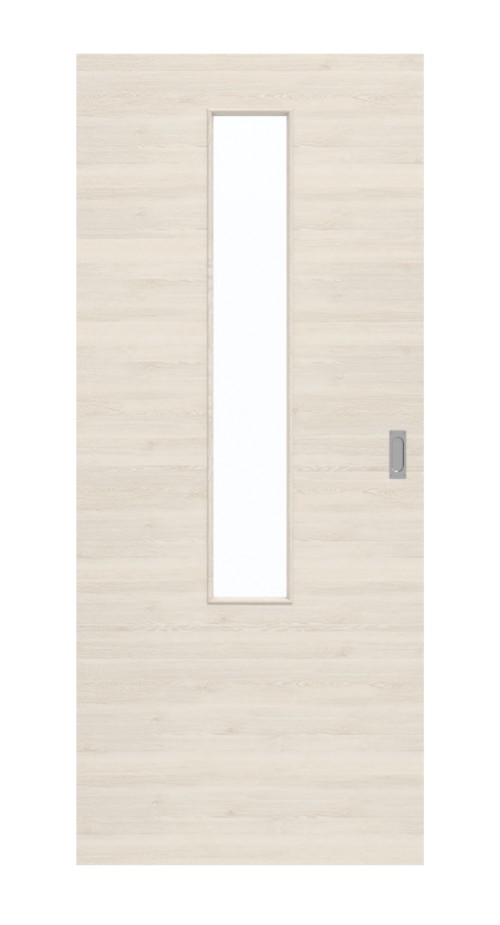 Dzięki wycięciu na szybę, umieszczonemu centralnie w górnej części skrzydła drzwiowego, światło wpada do pomieszczeń. Drzwi przesuwne przekonują swoim nowoczesnym designem. Drobne usłojenia rozciągają się na skrzydle drzwiowym w jasnym wykończeniu wizualnym drewna. Poziome ułożenie rysunku nadaje całości wyrafinowany charakter. Powierzchnia HPL okazuje się niezwykle wytrzymała i odporna na wysoką temperaturę.