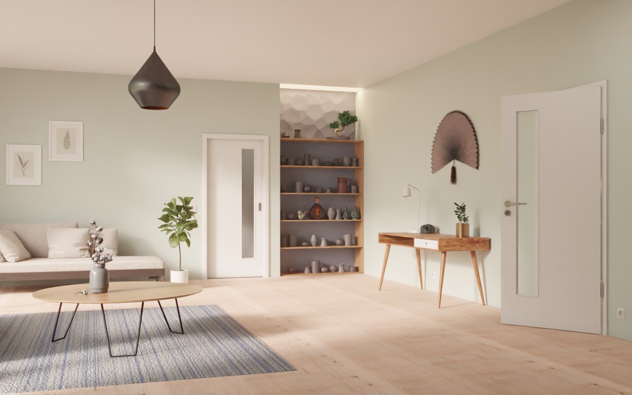 Centralnym elementem projektu drzwi jest smukły, prostokątny otwór na światło. Innowacyjna powierzchnia G-TEC w matowym białym lakierze 9016 pozostaje wolna od odcisków palców po dotknięciu. Ponadto wykończenie o wysokim stopniu matowości folii dekoracyjnej nadaje jej nowoczesny i elegancki wygląd.