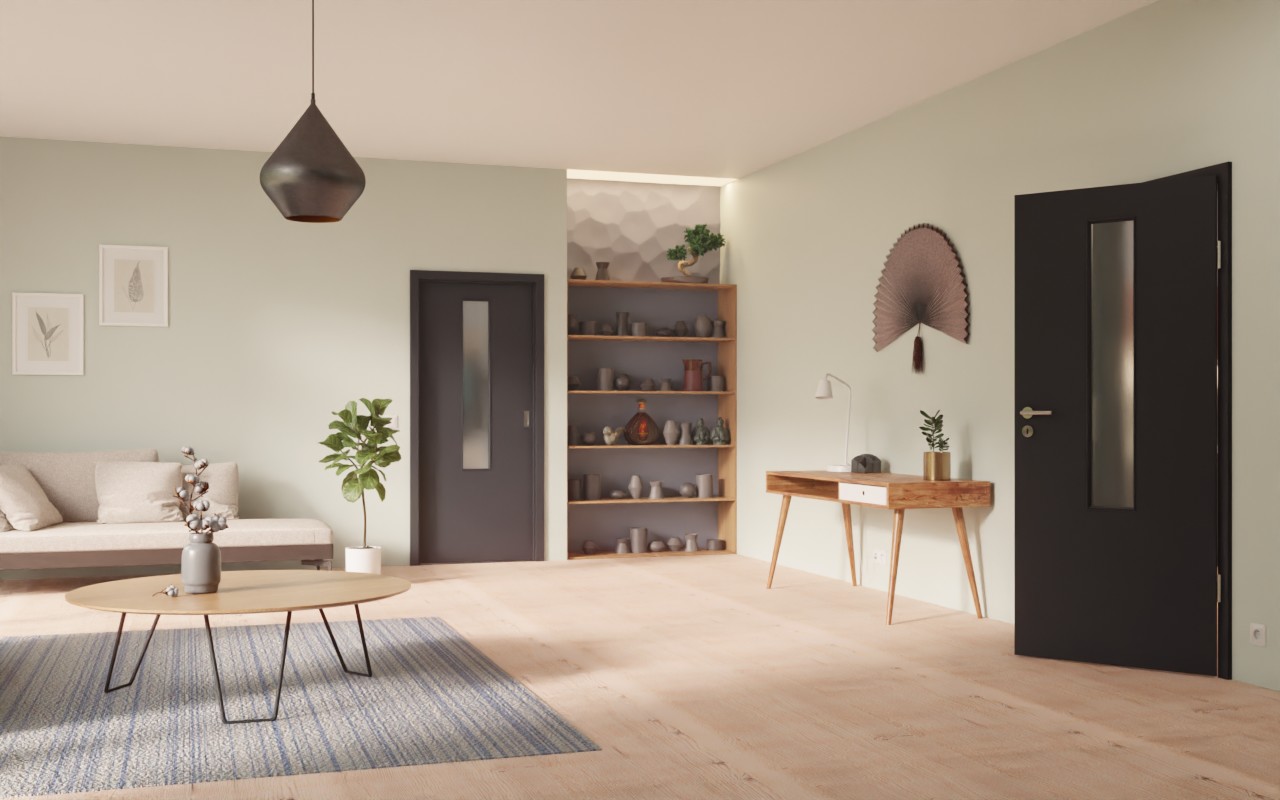 W środkowej części górnej części drzwi znajduje się krótki, wąski otwór na światło , który pełni funkcję dekoracyjną. Trwały efekt antyodciskowy zapewnia innowacyjna powierzchnia G-TEC w kolorze czarnym matowym RAL 9005. Folia dekoracyjna Hochmatte wyróżnia się przede wszystkim swoim nowoczesnym wyglądem.