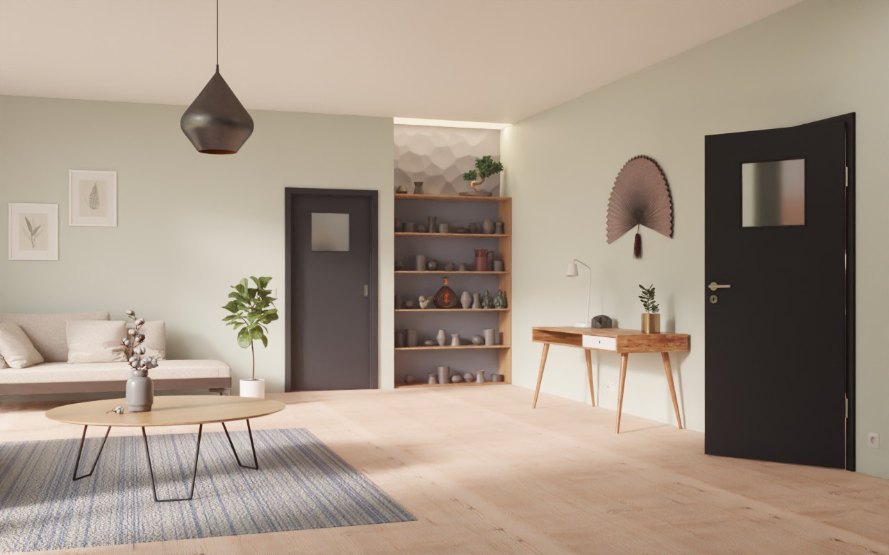Atrakcyjne drzwi przesuwne z folią dekoracyjną G-TEC w macie RAL 9005 - w zestawie z kwadratowym uchwytem i rowkiem podłogowym: