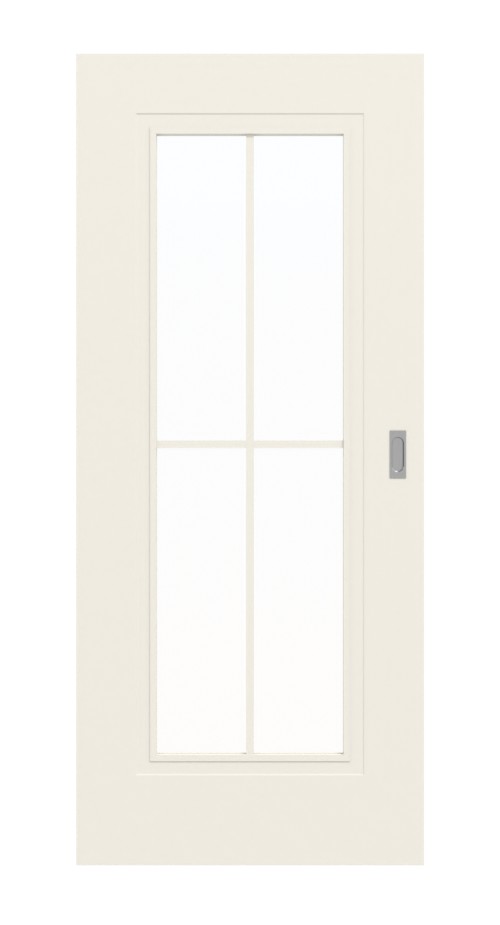 Szerokie frezowania wokół dużego wycięcia na szybę tworzą piękną ramę. Prosta rama ze szprosami dzieli powierzchnię na cztery pola. Kolor matowej bieli , dostępny w odcieniach RAL 9010 lub RAL 9016, nakładany jest w ramach ekologicznego procesu lakierowania.