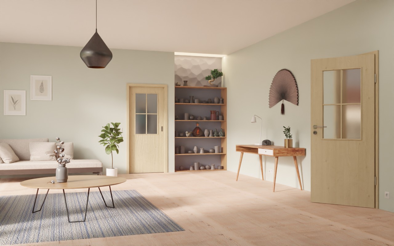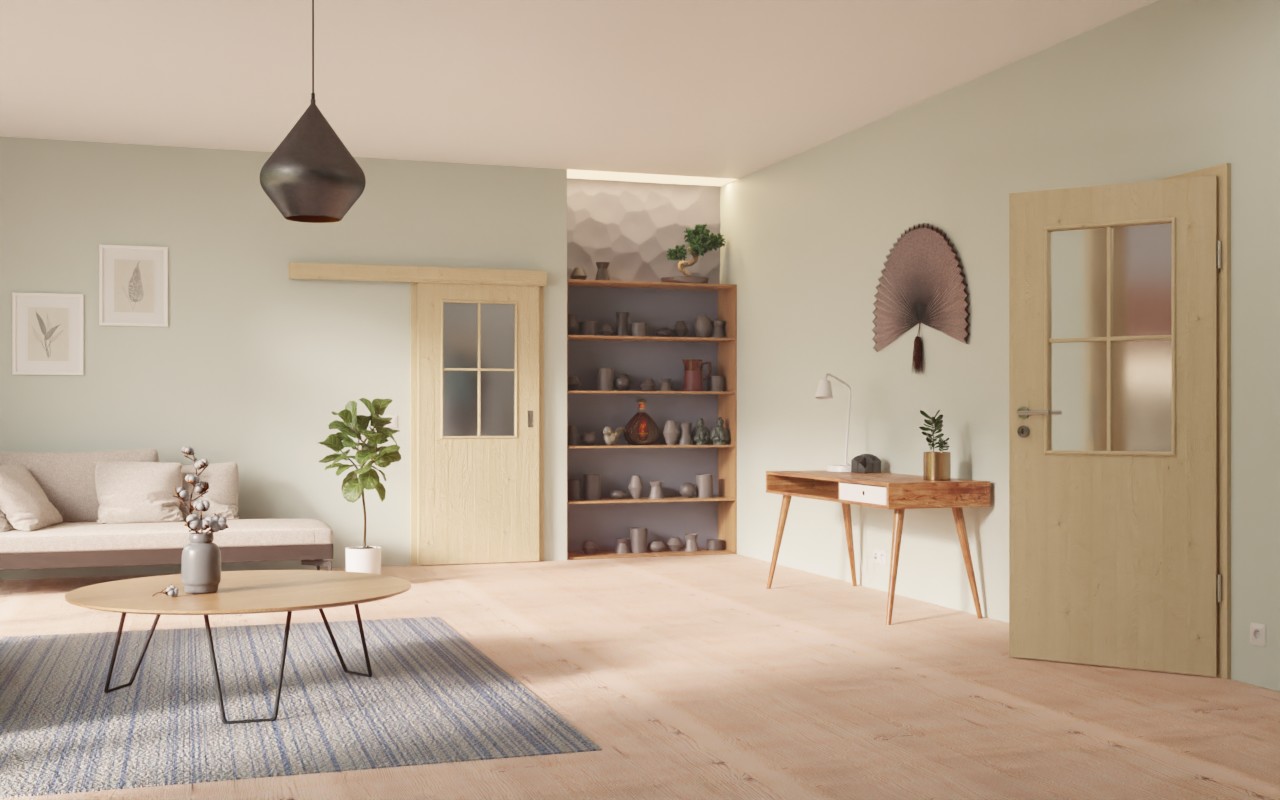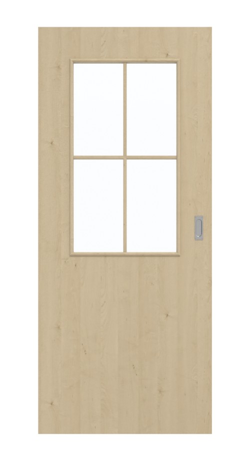 Jasną atmosferę w pomieszczeniach tworzy obszerne wycięcie na szybę, które zdobi górną część skrzydła drzwiowego. Eleganckie szprosy nadają im piękny wygląd. Dzięki naturalnemu dekorowi w kolorze klonu drzwi pasują do wszystkich warunków montażu. Jasna stylistyka sprawia wrażenie powściągliwej. Delikatne usłojenia dopełniają całościowy obraz. Materiał powierzchniowy wykonany jest z łatwego w pielęgnacji i wytrzymałego CPL.