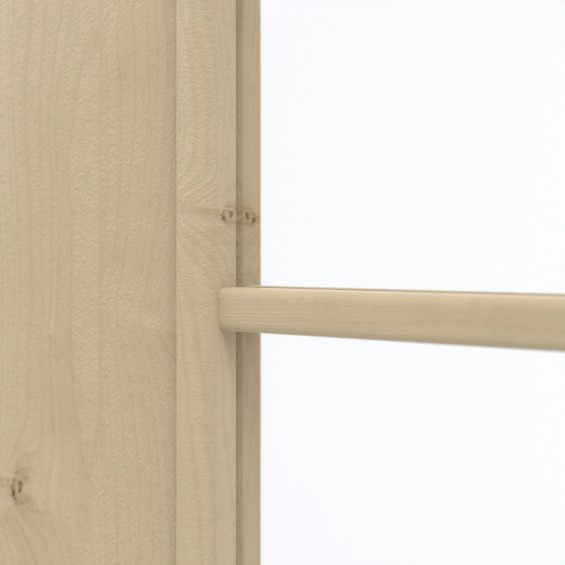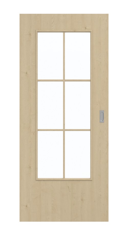 Duże przeszklenie umieszczone pośrodku skrzydła drzwiowego zapewnia jasne wnętrze. Elegancka rama z szprosami dzieli szkło na sześć mniejszych prostokątów. Drzwi przesuwne o wyglądzie klonu można połączyć z każdym stylem wyposażenia wnętrz. Jasna stylistyka sprawia wrażenie powściągliwej. Pionowe usłojenia i drobne sęki zdobią skrzydło drzwiowe. Materiał powierzchniowy wykonany z CPL jest wytrzymały i odporny na zarysowania.