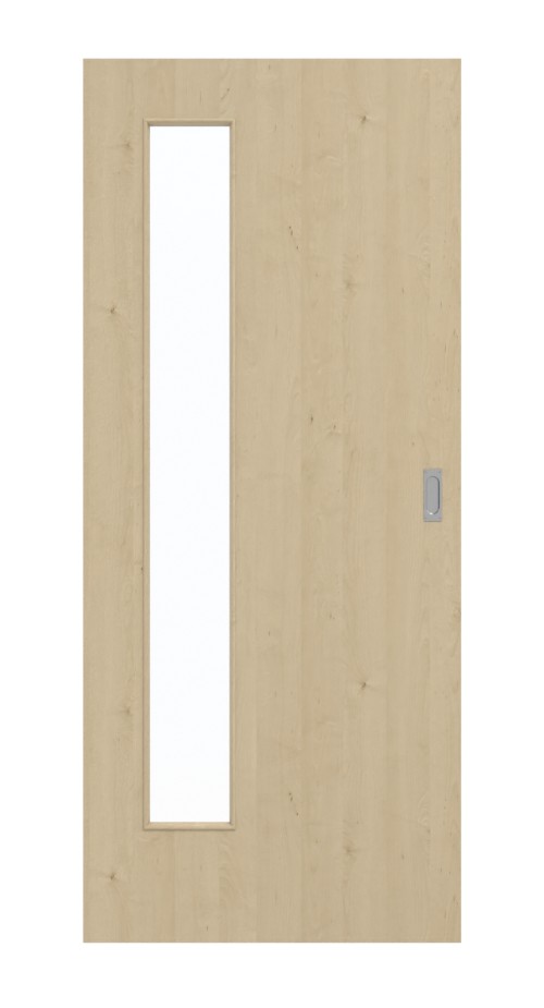 Przyjemną atmosferę we wnętrzu zapewnia wąskie wycięcie na szybę, umieszczone po stronie zawiasów skrzydła drzwiowego. Drzwi przesuwne z dekorem klonowym stylowo komponują się z nowoczesnym wystrojem wnętrz. Dzięki jasnej kolorystyce projekt sprawia wrażenie stonowanego. Drobne sęki i delikatne słoje biegną pionowo wzdłuż skrzydła drzwi. Wierzchnia warstwa z HPL jest wyjątkowo odporna na obciążenia mechaniczne, światło i ciepło.