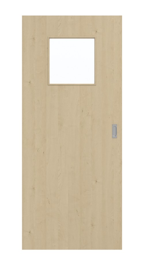 Dzięki kwadratowemu wycięciu w szybie, umieszczonemu na wysokości oczu w skrzydle drzwi, do Twojego domu wpada światło, a wraz z nim przyjazna atmosfera. Drzwi przesuwne w wykończeniu imitującym klon gustownie komponują się z nowoczesnym wystrojem wnętrz. Dzięki jasnej kolorystyce projekt sprawia wrażenie stonowanego. Drobne sęki i delikatne słoje biegną pionowo wzdłuż skrzydła drzwi. Wierzchnia warstwa z HPL jest wyjątkowo odporna na obciążenia mechaniczne, światło i ciepło.