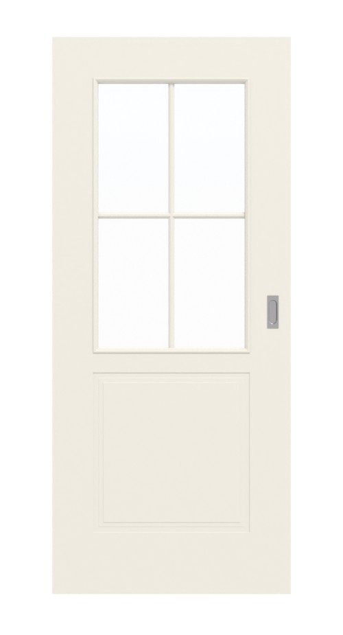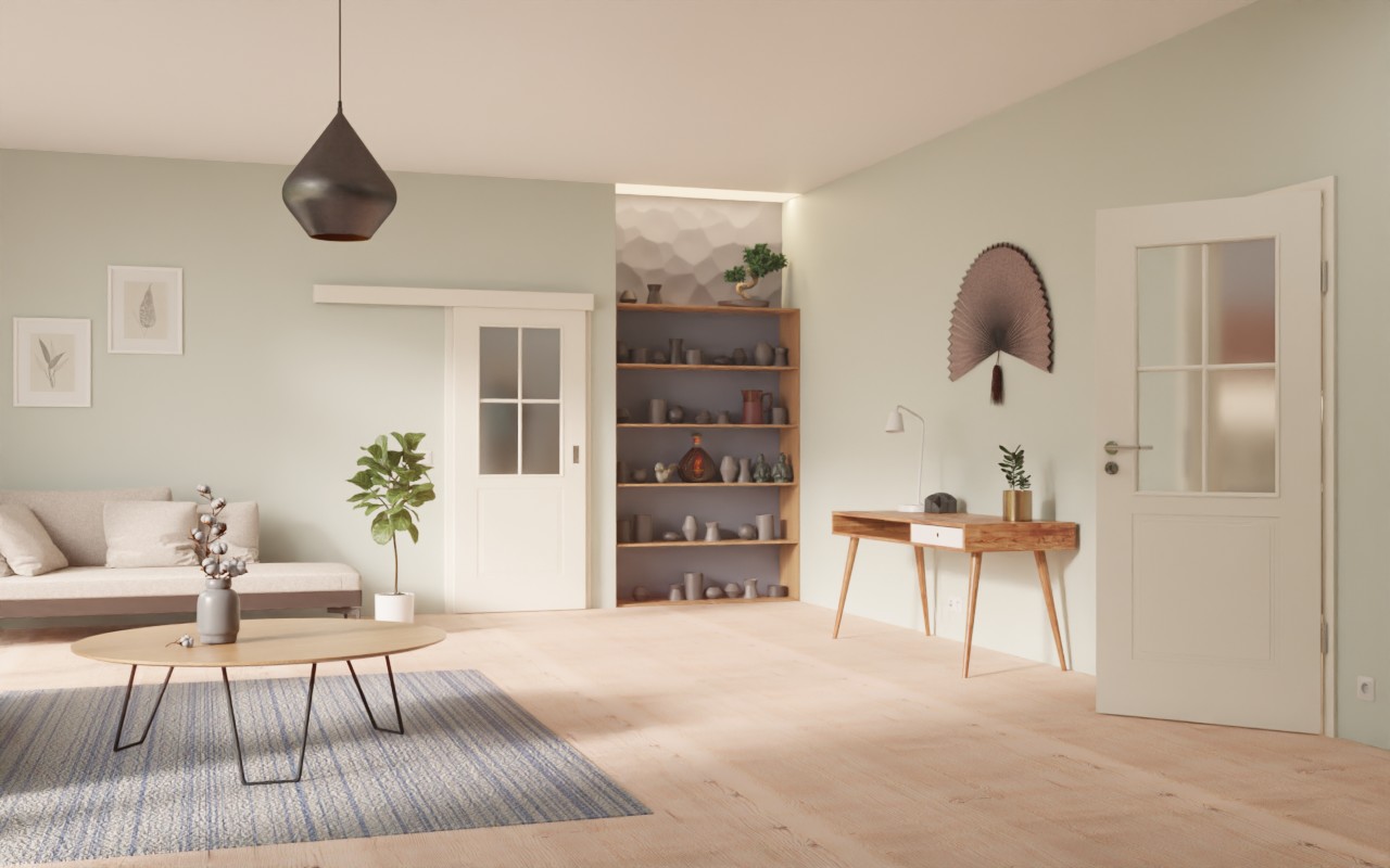 Dzięki dużemu przeszkleniu drzwi wpuszczają do pomieszczenia jasność. Elegancka ramka z pionowymi listwami stylowo dzieli otwór. W dolnej części skrzydła drzwiowego wyfrezowano mniejszą kasetę profilową . Jedwabiście matowy biały lakier jest nakładany w ramach ekologicznego procesu wielokrotnego lakierowania, a dzięki utwardzaniu promieniami UV jest trwały i łatwy w pielęgnacji.