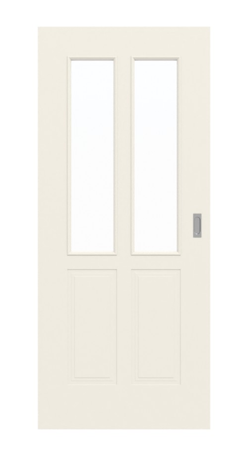 Dwa wąskie otwory na światło w górnej części drzwi oraz dwie krótsze, wfrezowane kasety profilowe poniżej nadają im klasyczny wygląd. Jedwabiście matowe, białe wykończenie uzyskuje się poprzez wielokrotne nakładanie lakieru akrylowego w kolorze RAL 9010 lub RAL 9016.