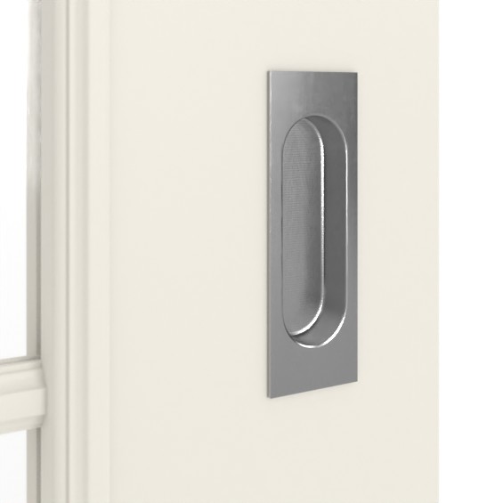 Podstawą skrzydła drzwi przesuwnych jest solidna płyta wiórowa. W cenie zawarte są nie tylko skrzydło drzwiowe, ale także prowadnica dolna oraz uchwyt w kolorze stali nierdzewnej o prostokątnym kształcie i owalnym wycięciu.