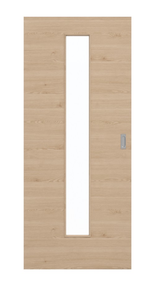 W środkowej części skrzydła drzwiowego znajduje się wąskie przeszklenie. Delikatne usłojenia i filigranowe sęki zdobią poprzeczny dekor drewna. Płynne rysunki sprawiają, że drzwi przyciągają wzrok. Dzięki naturalnemu brązowemu kolorowi drzwi przesuwne tworzą przytulną atmosferę we wnętrzu. Zarysowania i zużycie mechaniczne nie mają prawie żadnego wpływu na powierzchnię CPL.