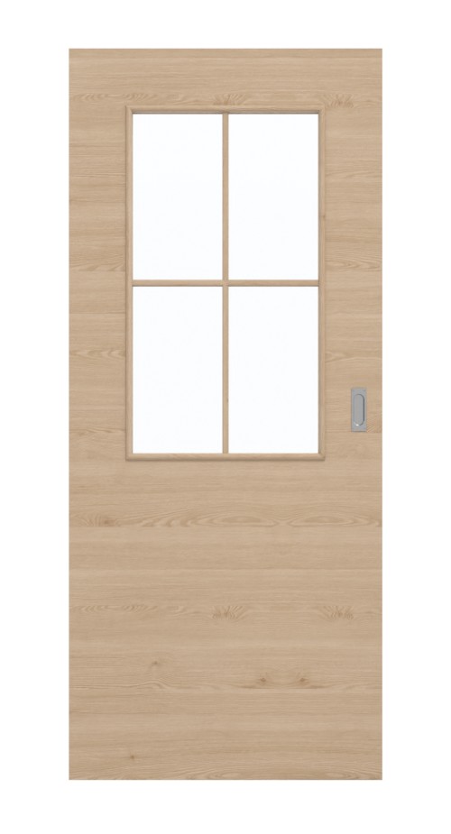 W górnej części skrzydła drzwiowego znajduje się szerokie wycięcie na szybę. Są one podzielone eleganckimi szprosami, które tworzą nastrojową atmosferę. Przez szkło przedostaje się dużo światła do pomieszczeń. Drobne wzdłużne usłojenia charakteryzują naturalny dekor drewna. Płynne rysunki sprawią, że design przyciągnie wzrok. Dzięki naturalnemu brązowemu kolorowi drzwi przesuwne tworzą przytulną atmosferę we wnętrzu. Materiał powierzchniowy wykonany z CPL jest wytrzymały i odporny na zarysowania.