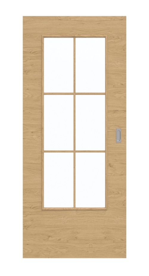 Otwór okienny pośrodku drzwi zapewnia jasność i przyjazną atmosferę w pomieszczeniach. Nałożona ramka z prętami dzieli go wizualnie na sześć pól. Drzwi przesuwne w stonowanych odcieniach brązu wyróżniają się nowoczesnym wyglądem. Rustykalny urok charakteryzuje poprzeczny dekor dębowy. Żywe usłojenia i drobne sęki zaokrąglone dopełniają imitację drewna. Łatwa w pielęgnacji warstwa wierzchnia z HPL jest odporna na czynniki zewnętrzne, takie jak ciepło, światło i obciążenia mechaniczne.