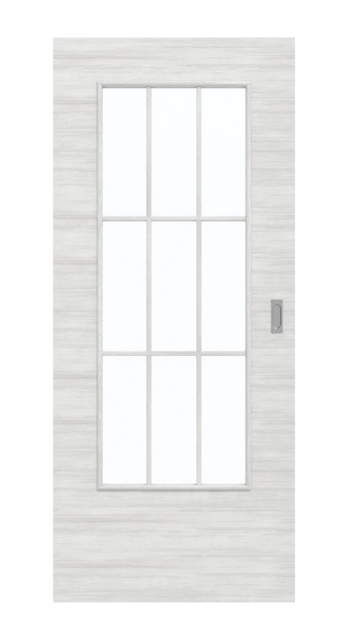 W środkowej części skrzydła drzwiowego znajduje się duże wycięcie na szybę. Dzięki przepuszczalnemu materiałowi do pomieszczeń wpada dużo światła. Elegancka rama szprosowa dzieli szklenie na równe prostokąty. Drzwi przesuwne z szarym dekorem drewna wyróżniają się modnym wyglądem. Smukłe usłojenia łagodnie przebiegają przez skrzydło drzwiowe. Dekor biegnie poziomo przez skrzydłoa drzwiowe i nadaje modelowi niepowtarzalny charakter. Powierzchnia HPL jest odporna na działanie światła i niezwykle wytrzymała.