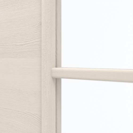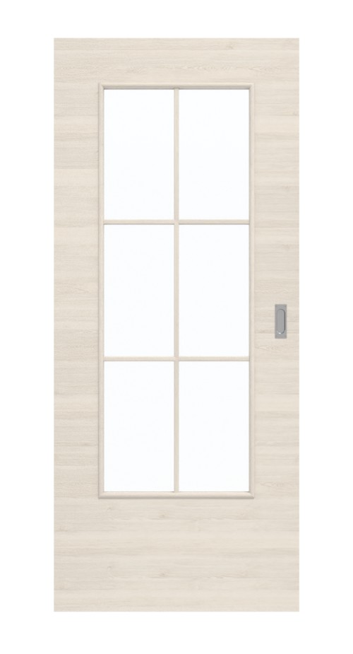 Dzięki wycięciu na szybę pośrodku skrzydła drzwiowego możesz cieszyć się jasnymi wnętrzami. Ozdobione prostymi, równomiernie rozmieszczonymi szprosami. Filigranowe usłojenia cechują jasny dekor drewna. Rysunek jest naniesiony poziomo. Powierzchnia HPL jest odporna na działanie światła i niezwykle wytrzymała.