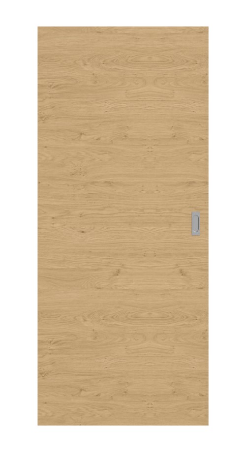 Naturalnie brązowe, gładkie drzwi przesuwne zachwycają swoim nowoczesnym wyglądem. Ciekawym detalem jest poziome ułożenie dekoru dębowego. Delikatne sęki i dynamiczne usłojenia przyciągają wzrok. Powierzchnia HPL okazuje się niezwykle wytrzymała i odporna na wysoką temperaturę.