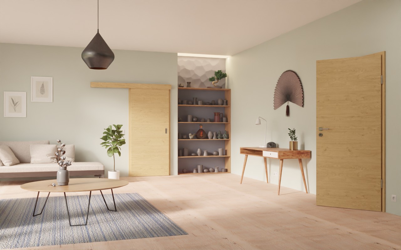 Rdzeń drzwi może być wykonany z płyty wiórowej pełnej lub płyty wiórowo-otworowej. Dzięki klasyfikacji do grupy obciążenia M nadaje się zarówno do użytku w pomieszczeniach biurowych, jak i do użytku prywatnego. Prostokątny uchwyt wpuszczany muszlowy z owalnym chwytem oraz rowek prowadzący podłogowy umożliwiają łatwe otwieranie i zamykanie.