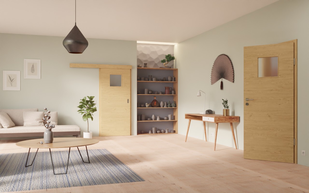Dzięki kwadratowemu otworowi okiennemu na wysokości oczu możesz cieszyć się jasnością i przyjazną atmosferą w swoich pomieszczeniach. Drzwi przesuwne zachwycą harmonijnymi odcieniami brązu i nowoczesnym charakterem. Wzór dębowy o poprzecznym układzie nadaje Twojemu domowi rustykalny charakter. Żywe usłojenia i delikatne sęki charakteryzują design. Powierzchnia wykonana z CPL charakteryzuje się ogromną wytrzymałością.