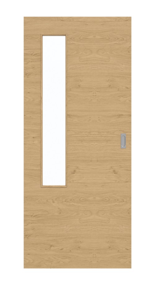 Dzięki prostokątnemu wycięciu w szybie po stronie zawiasów mogą Państwo cieszyć się światłem, a tym samym przyjazną atmosferą w swoich pomieszczeniach. Nowoczesny design charakteryzuje te naturalnie brązowe drzwi przesuwne. Ciekawym detalem jest poziome ułożenie dekoru dębowego. Dynamiczne usłojenia i subtelne sęki przyciągają wzrok. Wierzchnia warstwa wykonana z CPL jest niezwykle trwała i odporna na zabrudzenia.