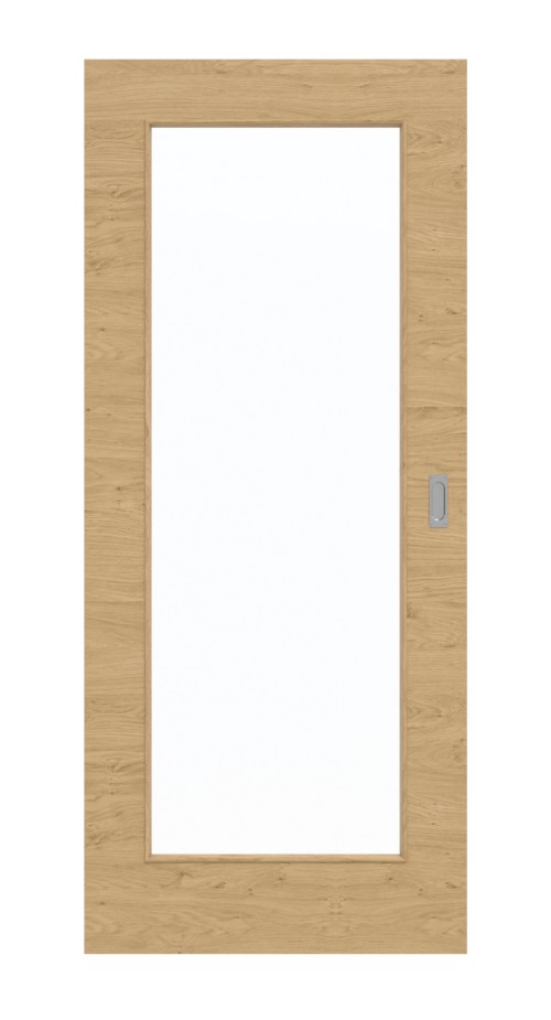 W środkowej części skrzydła drzwiowego znajduje się duży otwór okienny . Ten model drzwi przesuwnych w naturalnym brązowym kolorze wyróżnia się nowoczesnym wyglądem. Dekor dębowy jest ułożony poziomo. Autentyczny efekt zapewniają żywe usłojenia i filigranowe sęki. Powierzchnia z płyty HPL jest odporna na działanie światła i niezwykle wytrzymała.