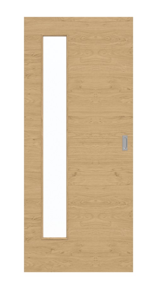 Po stronie zawiasów skrzydła drzwiowego znajduje się podłużne wycięcie na szybę. Jest to nie tylko nowoczesny element stylistyczny, ale także pozwala wpuszczać światło do pomieszczeń. Model z drzwiami przesuwnymi w naturalnych odcieniach brązu prezentuje się nowocześnie. Wyrafinowany efekt daje wzdłużne ułożenie dekoru dębowego. Dynamiczne usłojenia i subtelne sęki przyciągają wzrok. Powierzchnia wykonana z HPL jest łatwa w pielęgnacji i odporna na zabrudzenia.