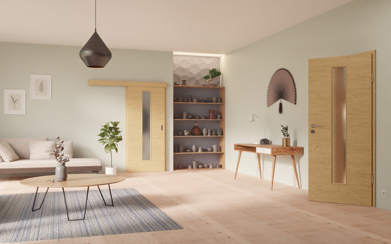 Oświetlenie pomieszczeń zapewnia wąski otwór okienny, umieszczony pośrodku skrzydła drzwiowego. Drzwi przesuwne zachwycają naturalną kolorystyką i nowoczesnym wzornictwem. Dekor dębowy jest ułożony poziomo. Żywe usłojenia i delikatne sęki charakteryzują design. Wierzchnia warstwa z HPL jest wyjątkowo odporna na obciążenia mechaniczne, światło i ciepło.