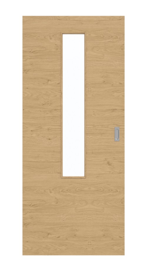 W środkowej części górnej części skrzydła drzwi wycięto podłużny otwór. Wąski otwór okienny zapewnia jasne wnętrze. Brązowe drzwi przesuwne zachwycają swoim nowoczesnym wyglądem. Ciekawym detalem jest poziome ułożenie dekoru dębowego. O autentyczność dbają dynamiczne słoje i subtelne sęki. Warstwa wierzchnia wykonana z HPL jest bardzo trwała i odporna na zabrudzenia.