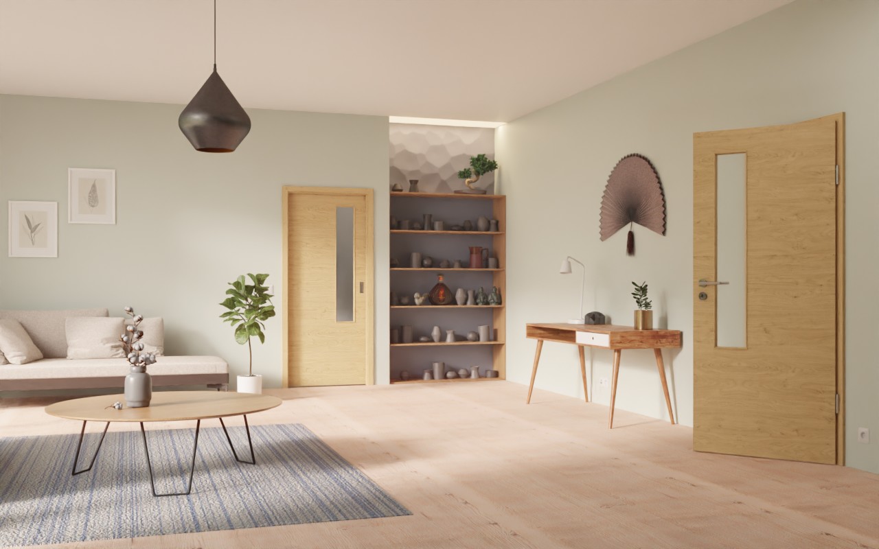 W pobliżu klamki znajduje się wąskie wycięcie na szybę. Nie tylko nadaje to skrzydłu drzwiowemu niepowtarzalny wygląd, ale także zwiększa jasność w pomieszczeniach. Model z drzwiami przesuwnymi w naturalnych odcieniach brązu prezentuje się nowocześnie. Dekor dębowy biegnie w poprzek skrzydła drzwi. Dynamiczne usłojenia i subtelne sęki przyciągają wzrok. Warstwa wierzchnia wykonana z HPL jest bardzo trwała i odporna na zabrudzenia.