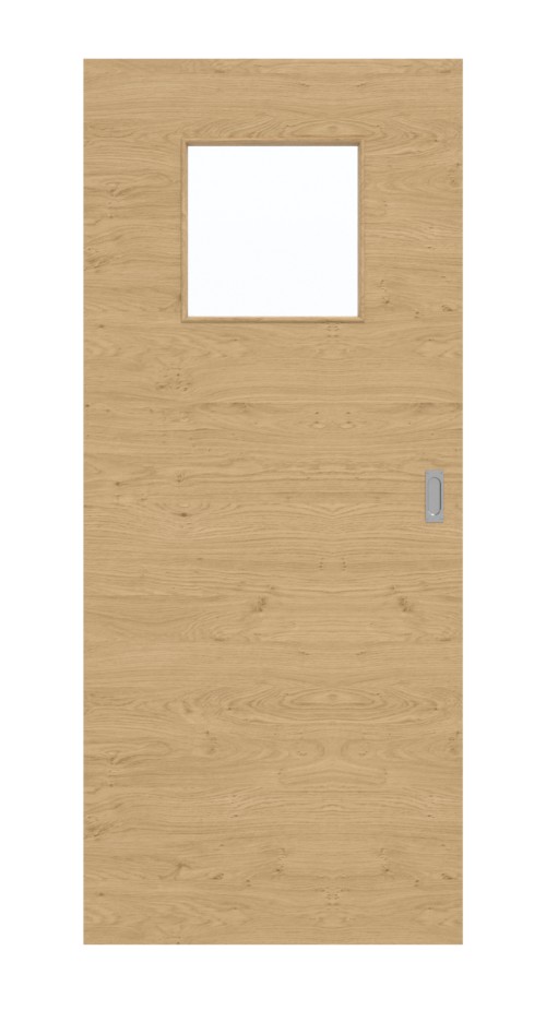Kwadratowe przeszklenie na wysokości oczu, które jest głównym elementem stylistycznym skrzydła drzwiowego, zapewnia jasność i przejrzystość pomieszczenia. Brązowe drzwi przesuwne zachwycają swoim nowoczesnym wyglądem. Dzięki poprzecznemu wzorowi imitującemu drewno dębowe drzwi przyciągają wzrok. Żywe usłojenia i drobne sęki zaokrąglone dopełniają imitację drewna. Powierzchnia HPL jest odporna na zarysowania i ścieranie.