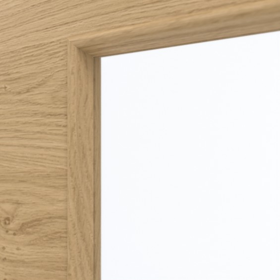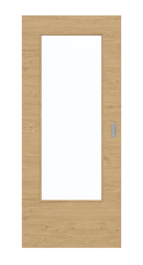Przeszklenie na środku skrzydła drzwiowego zapewniające jasność i przyjazną atmosferę we wnętrzu. Drzwi przesuwne zachwycają naturalną kolorystyką i nowoczesnym wzornictwem. Rustykalny urok charakteryzuje poprzeczny dekor dębowy. Żywe usłojenia i drobne sęki zaokrąglone dopełniają imitację drewna. Wierzchnia warstwa z HPL jest wyjątkowo odporna na obciążenia mechaniczne, światło i ciepło.
